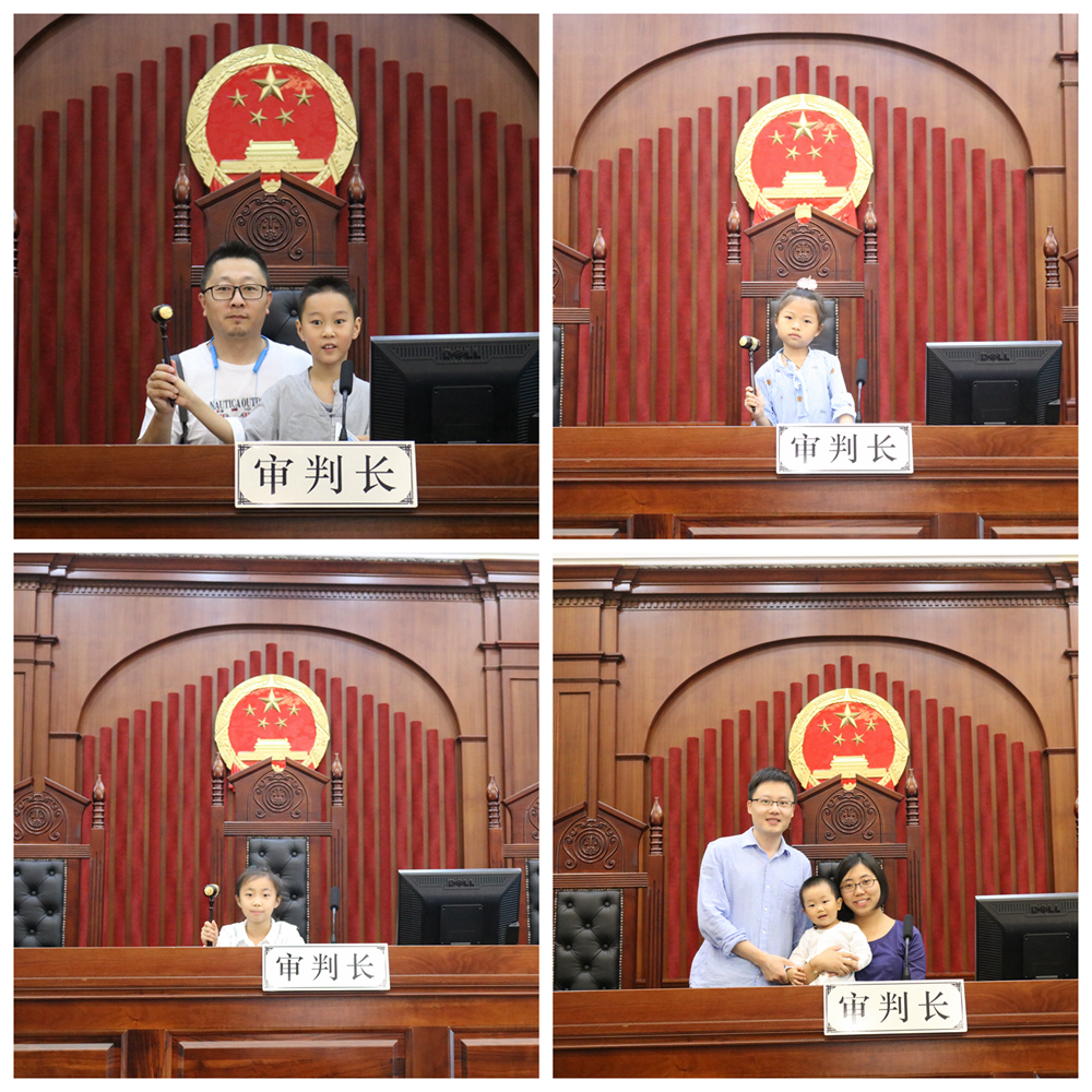 为体现我校政法院校的特色专业优势,校工会、校团委组织了志愿者在模拟法庭为孩子们举办了一场别开生面的模拟法庭表演。精彩的案例演绎让宝贝们看得津津有味,庭审结束后,大家纷纷到审判席拍照留念,体验法庭的神圣与庄严感。通过此次活动,孩子们与庭审现场实现了零距离的“接触”,法制教育更加生动形象。此外,还有法官、检察官、警察等角色体验,感受执法人员的神圣与光荣。今日我是“小小法官”,他日我做国家栋梁。