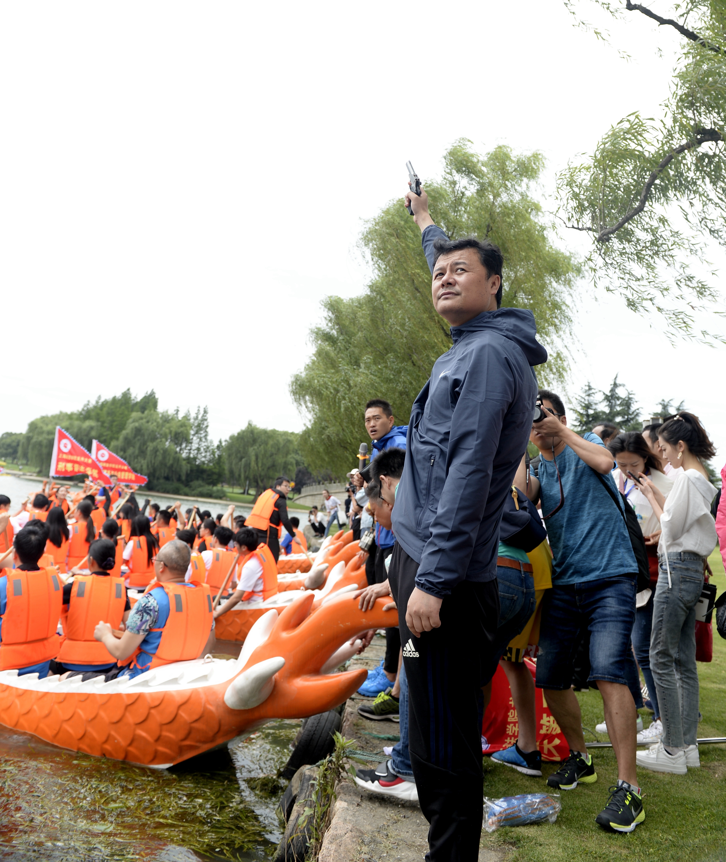 随着发令枪响,各参赛队员踩着铿锵的鼓点,低头弓背、挥桨竞渡,推动龙舟劈波斩浪、奋勇向前。