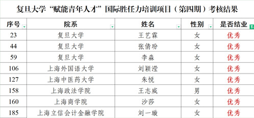 “赋能青年人才”国际胜任力培训项目(第四期)考核结果——“优秀学员”名单/表复旦国协