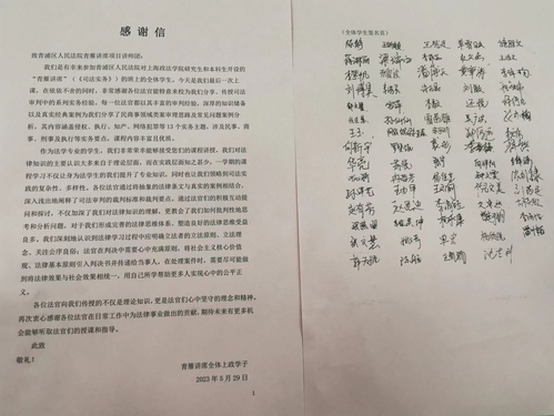 至此,“青雁讲席”暨《司法实务》课程的十三期讲授画上了圆满的句号。既是法官,又是老师,十三位法官以巧妙的课程设计、丰富的审判经验、全面的案例阐释、独特的个人魅力,让一堂堂课程立体生动、干货满满,让同学们沉醉其中、受益匪浅。课程的最后,老师同学们向法官递交了联名感谢信,对各位法官一学期的传道授业致以最诚挚的感谢。(沈吉利 撰稿)