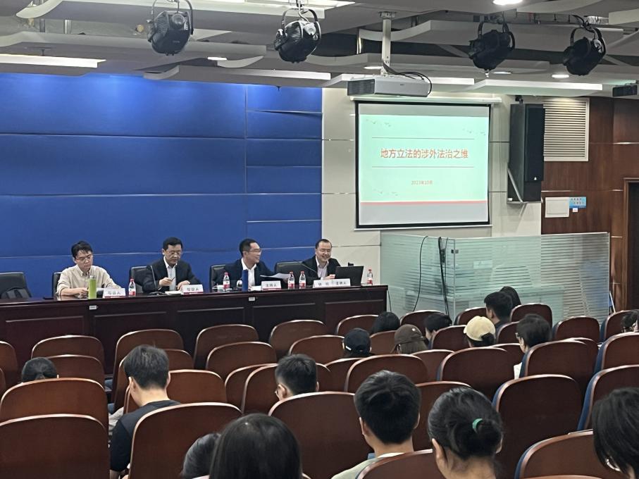2023年10月25日,由我校国际法学院承办的“佘山国际法讲坛”第五讲在庸夫楼112会议厅成功举办。上海人大常委会法工委副处长林圻博士为我校师生做了“地方立法的涉外法治之维”的主题讲座。林圻博士先从我国立法体制与立法程序入手,详尽分析在“统筹国内法治与涉外法治”大背景下地方立法因应。林博士又以上海浦东自由贸易试验区涉外立法实践为例,点出地方立法中依职权立法与依授权立法的区别,强调混合立法权下的地方立法发展应有的新动态。最后,林博士指出浦东自贸区的法治示范作用,强调从自贸区到引领区的身份转变,做好统筹内外法治的战略链接。