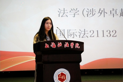 法学(涉外卓越班)国际法21132班张一洲作为优秀学生代表进行发言。她结合自身经历,从专业学习、课外实践和国际化探索三方面分享成长心得。她谈到学校的相关课程为有留学需要的同学打下了扎实的基础,同时也为同学们深入学习国际法相关知识提供了平台和资源,她鼓励大家主动探索,积极参与实习和重大赛事,拓宽全球视野。