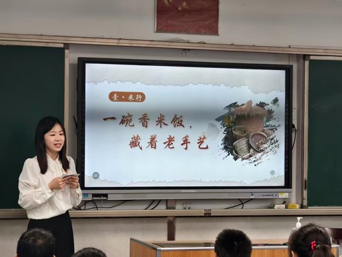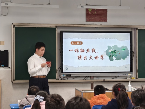 本次宣讲以“探寻松江非遗的前世今生”为脉络,精选了张氏米行、松江土布、松江顾绣三项贴近日常生活的代表性非遗项目展开。同时,宣讲团结合朱家角小学学生的认知特点,打破传统说教式宣讲模式,通过实物展示、趣味问答、影像展播等多元形式,生动解码松江仓城非遗文化。三位领学人通过对“三碾两筛”老工艺的拆解,结合“平斗满升”的诚信典故,让孩子们明白了“一粥一饭,当思来处不易”的深刻道理。在展示松江土布时,蓝草染织的实物图片与现代文创产品形成鲜明对比,孩子们直观看到了传统蓝染技艺与现代时尚的融合,现场不时发出惊叹声。而松江顾绣的讲解则将活动推向高潮,领学人生动讲述了绣娘“劈丝如发”的精湛技艺与数百年的传承坚守,深深打动了在场每一位同学。