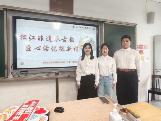 为深化大中小学思政教育一体化建设,推动中华优秀传统文化创造性转化、创新性发展,引导青少年近距离感受非遗文化魅力,2026年3月17日,国际法学院(国际仲裁学院)“法翼”宣讲团走进朱家角小学,开展以“仓城古韵,文化新生”为题的传统文化专题宣讲。宣讲团成员叶雯靖、齐文涵、白力玮担任领学人,带领同学们开启了一段趣味十足的松江非遗探秘之旅,让古老非遗技艺在校园焕发新活力。