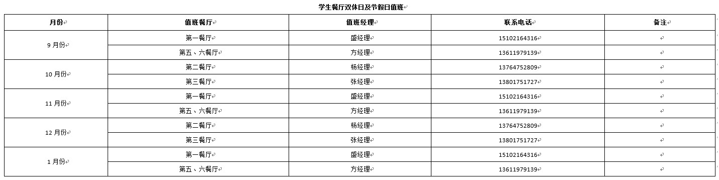 根据学校后勤保障工作安排,现将2016年秋季学期学校餐厅双休日及节假日期间开放值班安排通知如下。