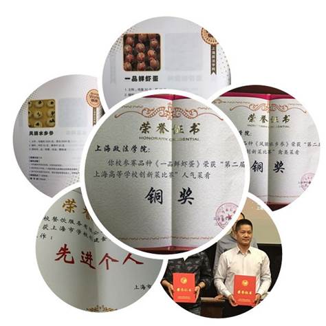 在上海市后勤协会餐饮管理专业委员会2015~2016年度会上,我校第五餐厅经理方振虎被评为“六T”工作先进个人,同时由我校参赛的第二届上海高等学校创新菜比赛中,第一餐厅厨师蔡森林参赛的《凤脯水乡参》、《一品鲜虾蛋》两道菜品荣获铜奖。