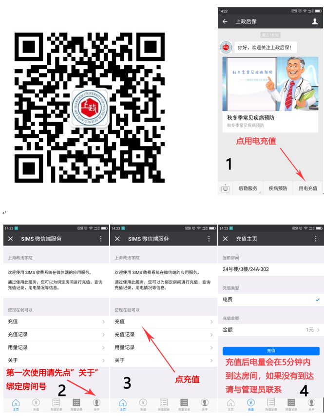 我校学生公寓智能电控改造升级现已完成,现投入试运行。学生点卡充值可通过以下流程对宿舍用电进行线上充值。详细操作流程如下: