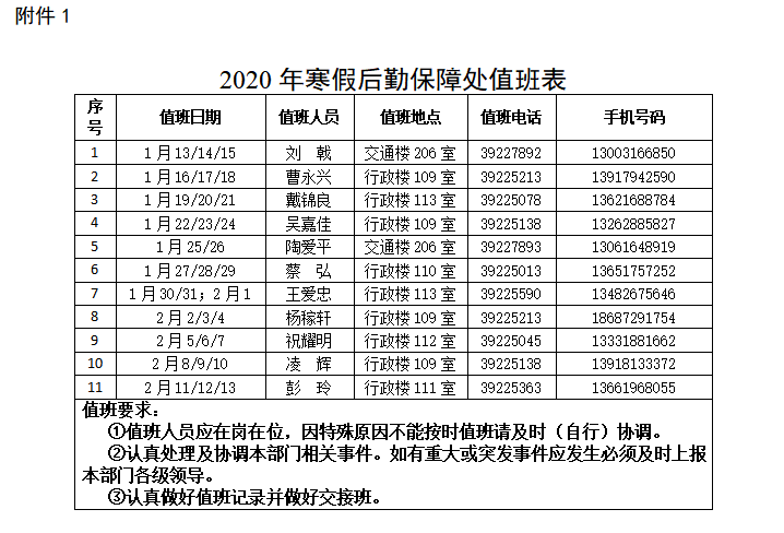 一、校后勤保障处2020年1月13日(周一)—2月13日(周四)安排专人值班,协调学校后勤保障工作(值班人员见附件1)。