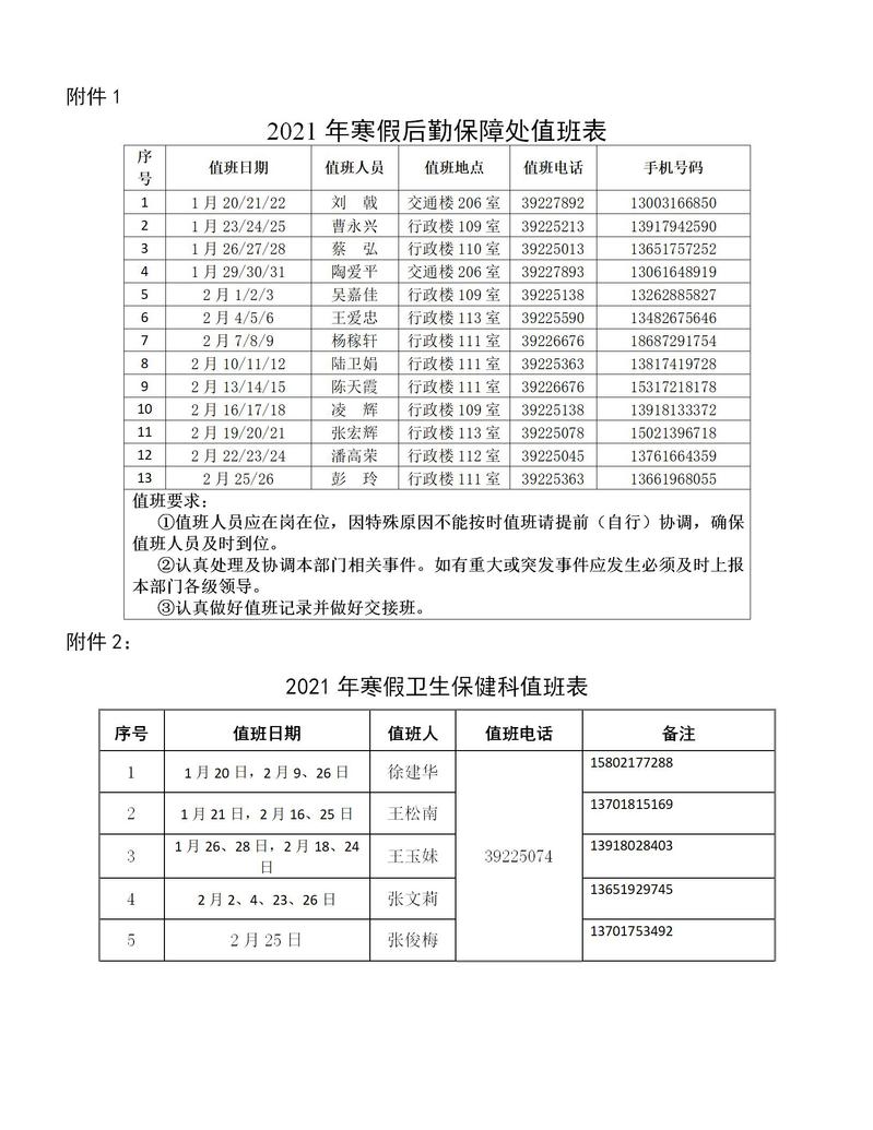 校后勤保障处2021年1月20日(周三)—2月26日(周五)安排专人值班,协调学校后勤保障工作(值班人员见附件1)。后勤保障处2月24日开始正常上班。