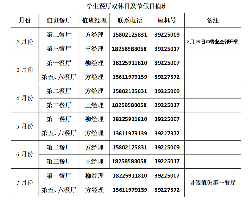 根据学校后勤保障工作安排,现将2022年春季学生餐厅双休日及节假日期间开放值班安排通知如下。