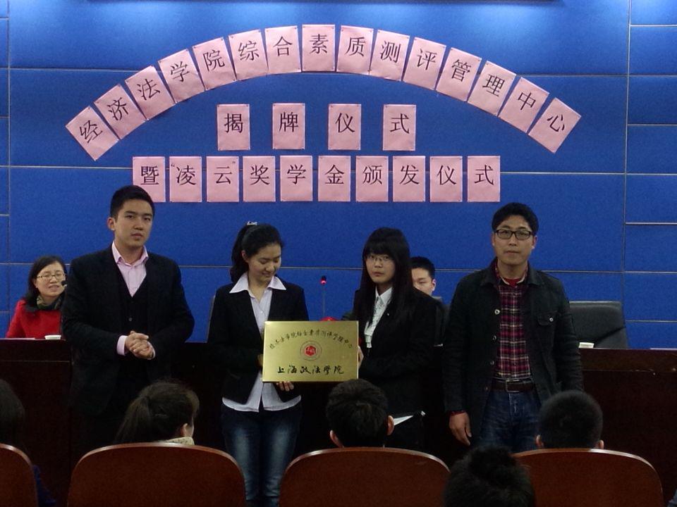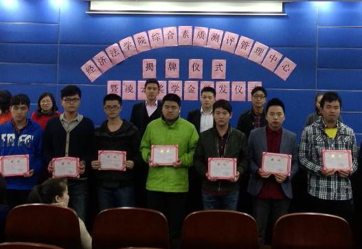 仪式主持人首先对经济法学院综合素质测评管理中心做了简单介绍。综合测评管理中心是我校第一个统一管理,监督综合测评和奖学金的机构,意在为学院同学营造一个公平公正的平台进行综合素质测评和奖学金评选。接下来,刘凌校友和经济法学院王洪全老师和为综合测评管理中心揭牌,并为获奖者颁发2013年度国家奖学金、上海市奖学金及2014年度“凌云”奖学金。