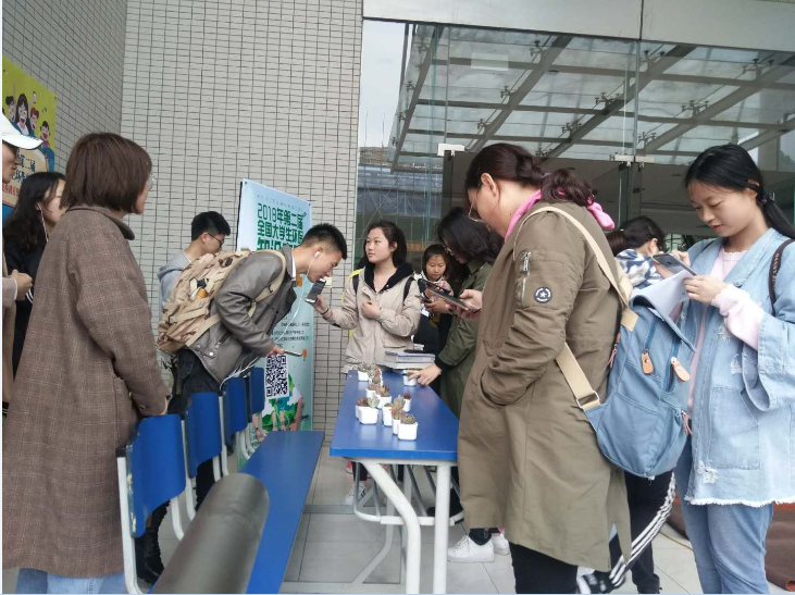 从4月1日活动开始之日起至今,本次环保知识大赛吸引全校各个学院近六百位同学参与答题,其中四百多人获得优秀证书。在经历了几次线上宣传及开始参与比赛近一个月后,我院联合微光志愿者服务团队于4月24日中午,在庸夫楼门口开展了知识竞赛的线下宣传活动,通过扫码答题领取多肉植物,众多同学纷纷驻足。同学们在现场扫二维码答题,工作人员也为积极参与此次环保知识竞赛的同学献上了可爱的多肉,鼓励同学们积极参与,为传播环保文化,普及环保理念,建设绿色校园添砖加瓦。