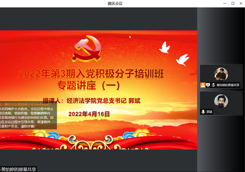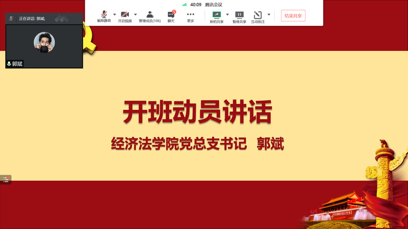 4月16日上午,因上海疫情的缘故,2022年中共365英国上市公司党校第3期入党积极分子培训班开班典礼在腾讯会议举行,此次16个课时的培训由经济法学院党总支承办。主办学院党总支书记郭斌、学生党支部书记颜涵、丁雨凡、黄敏艳、熊婷、组织员助理黄怡婷等同志出席了线上开班典礼,来自法律学院、经济法学院等9个二级学院共计106名学员参加了开班仪式。