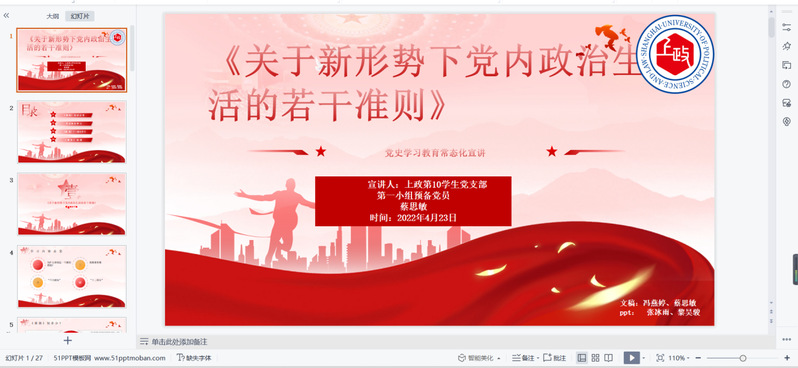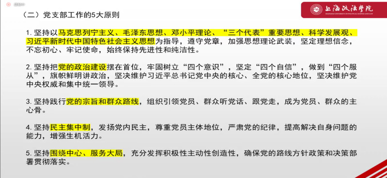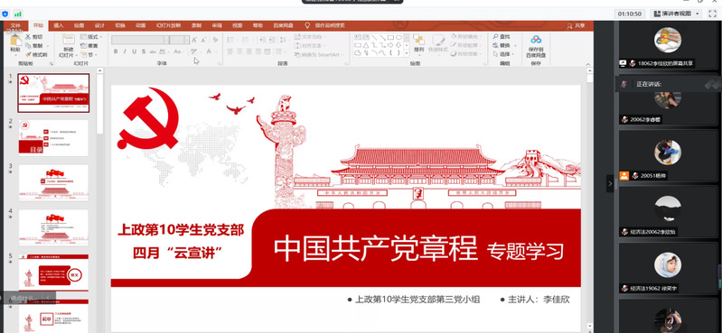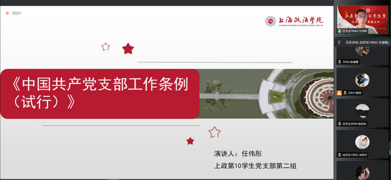 2022年4月23日,为深化学生对党章党规的认识学习,上政第10学生党支部于线上开展党史学习教育常态化宣讲会。支部书记颜涵,党员、发展对象、积极分子、入党申请人共160余人参与此次宣讲会,宣讲会由杨帅主持。