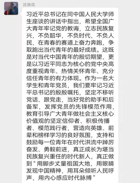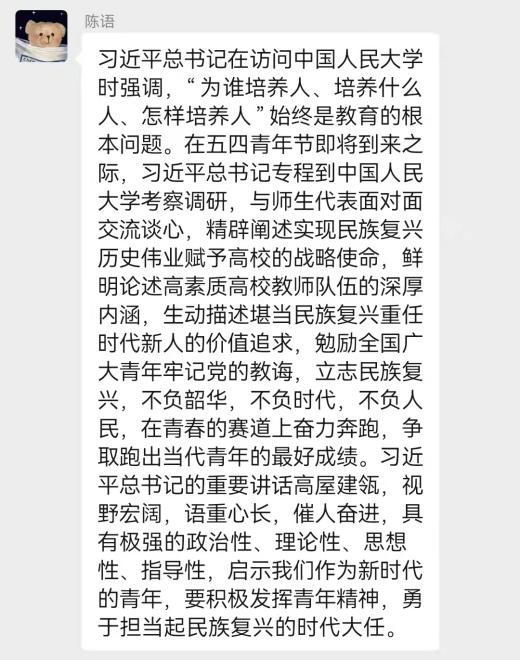 习近平总书记在中国人民大学考察时的重要讲话充分体现了以习近平同志为核心的党中央对我们新时代大学生们的关心与激励,让我深受鼓舞。作为新时代的学生党员,我们要不断提升自身的理论修养、夯实理论根基,并投身到中国梦的伟大实践中。要牢记初心使命,做习近平新时代中国特色社会主义思想的坚决拥护者和坚定捍卫者。作为法学学生,也要学好用好习近平法治思想,发挥自身专长优势为社会主义法治建设做出应有贡献。我们要牢记党的教诲,在青春的赛道上奋力奔跑,争取跑出当代青年的最好成绩。