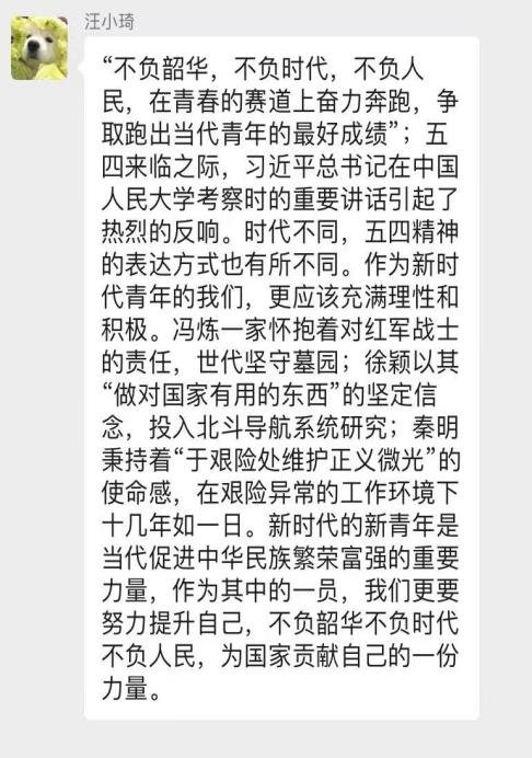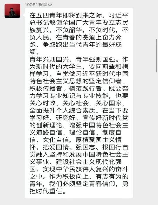 五四青年节即将到来之际,习近平总书记来到中国人民大学考察,深情寄语广大青年。“不负韶华,不负时代,不负人民,在青春的赛道上奋力奔跑,争取跑出当代青年的最好成绩。”为此我深受鼓舞,从对高等学府的建设要求到对广大青年意识形态进步的殷切期望,总书记的话让我进一步意识到了“思想上、行动上的先进性和纯洁性”是作为一名不断向党组织靠拢的高校青年应当具备的基本素养。就以此次疫情举例,我们应当努力发挥先锋模范作用,多“走在前列”、多“倾听群众呼声”、多“做实事、担责任”,真正做到把对祖国血浓于水、与人民同呼吸共命运的情感贯穿整个过程中。立足新时代新征程,也正如习近平总书记所言,我们应当拥护党的执政,坚定不移听党话、跟党走,将口号落实到具体的生活实践中,努力成长为堪当民族复兴重任的时代新人;而作为一名法学专业的学生,我们更要坚定理想信念,努力锤炼本领,弘扬法治的指引作用和教育作用,争取为党、为社会、为人民做出自己的贡献。