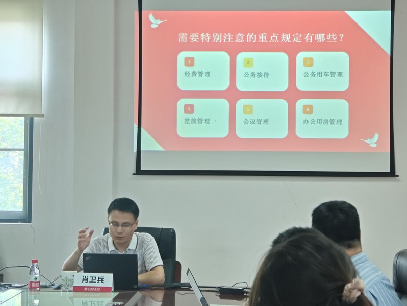 为进一步推动深入贯彻中央八项规定精神学习教育走深走实,弘扬厉行节约、艰苦奋斗的精神,2025年6月17日下午,经济法学院党总支委员、副院长肖卫兵于B1-201以“《党政机关厉行节约反对浪费条例》解读”为题讲授专题党课。本次学习会由上政第10学生党支部书记周嘉晟主持,上政第10学生党支部全体党员参加本次党课学习。