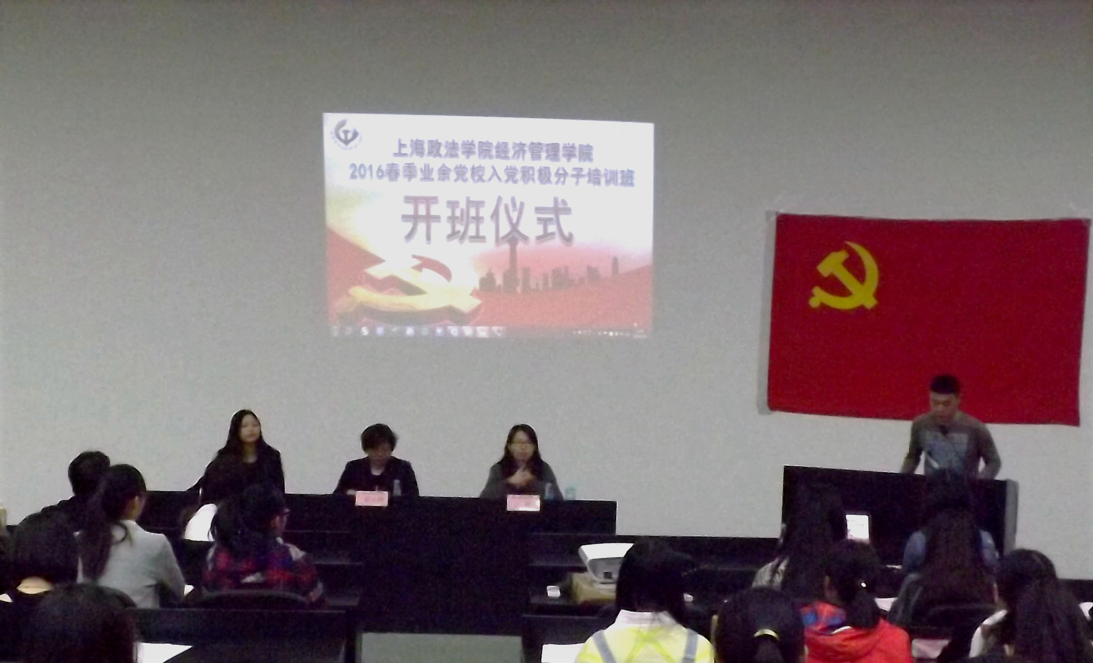 2016年3月29日下午一点整,经济管理学院2016年春季(第二十一期)入党积极分子培训班开班典礼暨第一堂党课在A4蓝教室顺利举行。经济管理学院党总支书记姜玉卿老师、党总支副书记江晨老师和党建督导老师张勤勤老师以及所有培训学员出席了开班典礼。