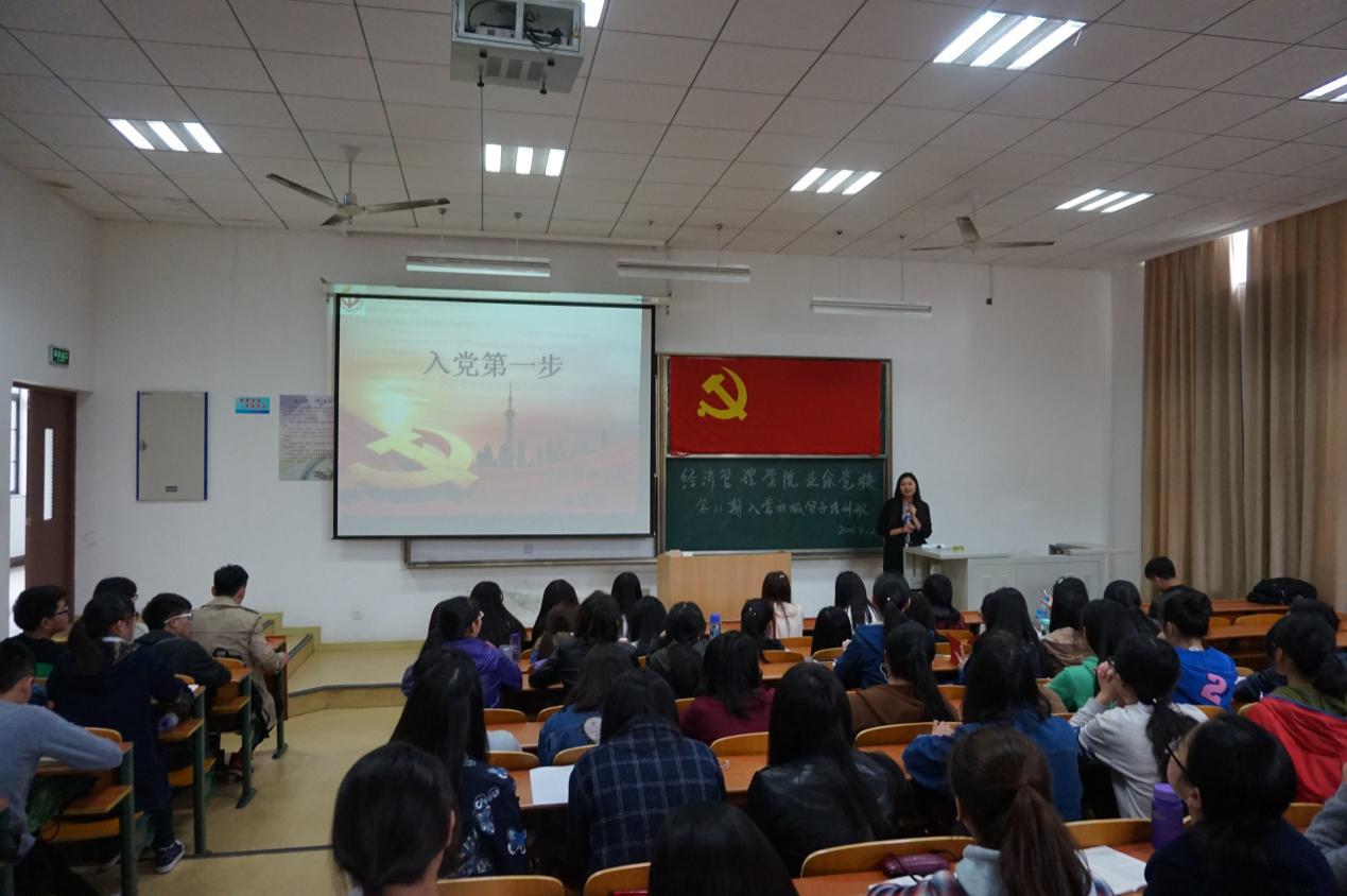 2016年4月12日下午一点,经济管理学院第21期入党积极分子培训班在A8-101教室顺利举行。首先由党建督导员张勤勤老师给学员们做了关于“了解入党流程,明确入党动机”的主题发言。张老师用一张清晰直观的入党流程图给学员们介绍了一名入党积极分子逐步发展成为中共党员的详细过程。紧接着进入小组展示环节。经过一个多星期的准备,五个小组分别以“我的入党动机”、“浅析两会热点问题——养老改革”、“浅谈——从严治党、反腐倡廉”、“浅谈一带一路”、“浅谈新环保法”为主题进行了小组调研成果展示。从各组制作精良的PPT,学员代表生动有趣的发言和优雅大气的演讲台风中,可以看出每个团队前期的精心准备和辛苦付出。张勤勤老师对每组付出的努力表示肯定,同时也对每个成果展逐一做了生动点评。