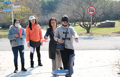 第五个任务点 “四渡赤水”是红军长征史上以少胜多,变被动为主动的光辉战例。毛泽东指挥中央红军三个月的时间六次穿越三条河流,转战川贵滇三省,巧妙地穿插于国民党军重兵集团围剿之间,不断创造战机,在运动中大量歼灭敌人,牢牢地掌握战场的主动权。此任务点中教职工们蒙着眼睛进行障碍躲避赛如红军穿越河流躲避敌军取得战役成功。