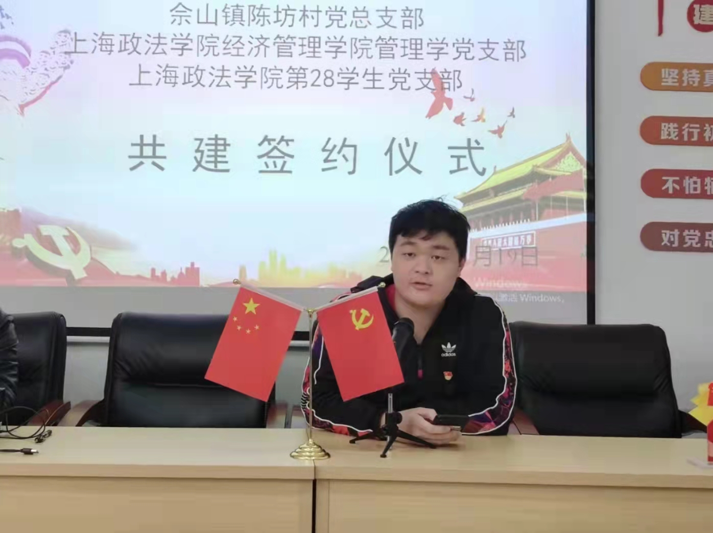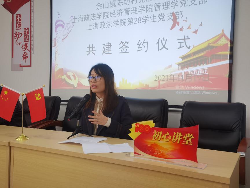 活动仪式上,三方互相介绍分享各自党建工作情况,就今后共建的内容、形式、要求进行了商讨研究,表示将通过村校党建共建推动阵地共创、产业共促,为服务地方经济发展贡献力量。随后,教工管理学党支部支委孔令媛、上政第28学生党支部支部书记郭平与陈坊村党总支书记陈国荣分别代表三方支部共同签订了共建协议。