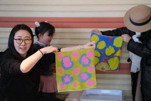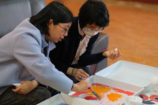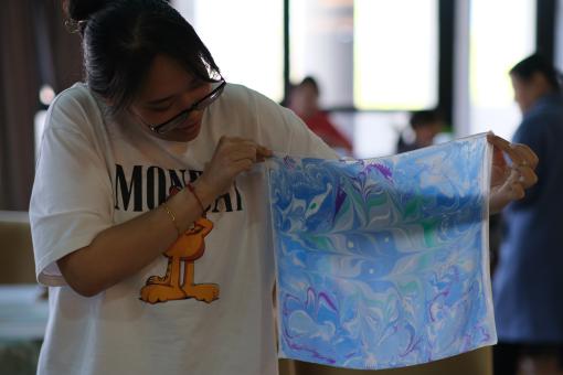 丝巾,是优雅的符号、温柔的象征,“水面作花,纸拓成画”。水拓画更是一种古老的绘画技法,独特的是不需要笔就能创作出色彩艳丽、纹理丰富的作品,它是世界非物质文化遗产,是人类文明的瑰宝。本次活动特邀两位校外老师对如何制作扎染进行现场指导,各位教师根据讲解的步骤,制作了属于自己的独一无二的艺术品。