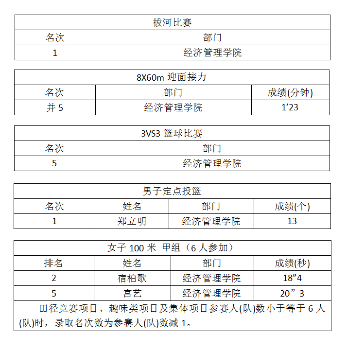 在拔河比赛中,经济管理学院一路过关斩将,最终在决赛中战胜对手,拔得头筹;宿柏歌荣获女子100米小组赛第二名,跑出了18”4的好成绩;郑立明荣获男子定点投篮第一名;在3VS3篮球比赛中,经济管理学院取得了第5名的优异成绩;在8X60m迎面接力比赛中,经济管理学院荣获第5名,取得了1’23的好成绩。教师们的出色表现不仅赢得了全场的热烈掌声和喝彩声,更为学院争得了荣誉。