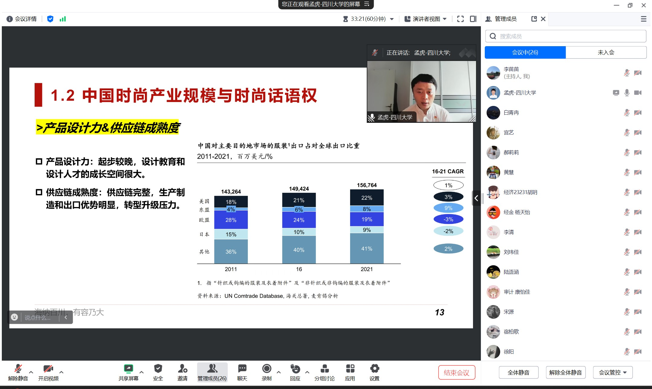 文化自信是新时代文化建设以及其他各项工作所要遵循的基本原则之一,是习近平文化思想的理论基石之一。党的二十大报告指出,从现在起,党的中心任务是全面建成社会主义现代化强国、实现第二个百年奋斗目标,以中国式现代化全面推进中华民族伟大复兴。纺织服装行业作为我国国民经济与社会发展的支柱产业、解决民生与美化生活的基础产业、国际合作与融合发展的优势产业,改革开放以来始终坚定文化自信、秉持开放包容、坚持守正创新,具有鲜明的中国特色、时代特征和人民属性,是中国式现代化的重要组成。孟虎老师分享了纺织服装行业整体发展状况,重点剖析中国时尚40年营商环境变革、时尚品牌升级与高质量增长策略、中国时尚产业和谐生态建设等内容。孟老师认为,在品牌方和产业各方的共同发力下,中国时尚产业将持续自我进化,必将涌现出更多优秀的国际知名品牌和原创设计,并不断优化和升级产业结构,进一步提升综合竞争力。