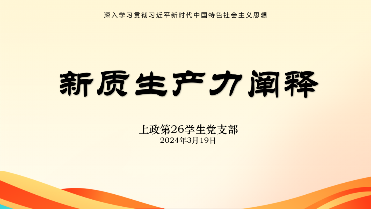 为深入开展学习贯彻习近平新时代中国特色社会主义思想主题教育,深化学生党员对生产力发展规律的认识,领悟习近平经济思想内涵。上政第26学生党支部于3月19日开展《新质生产力阐释——推动高质量发展的内在要求和重要着力点》专题党课学习。