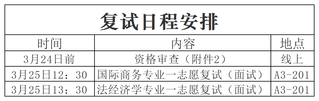 2024年3月25日进行国际商务专业与法经济学专业复试。3月22-24日进行复试考生资格审查(所需材料见附件2)。资格审查采取线上线下相结合的方式,请各位考生在3月24日前将电子版材料发送至邮箱:inuyasha2021@sina.com,邮件注明姓名、初试准考证号、报考专业。复试当天现场核查原件、收取复印件。资格审查未通过或未进行资格审查的考生一律不得参加复试。考生应当确保提交材料真实有效,如有虚假将依规处理。复试当天,具体安排见下表。