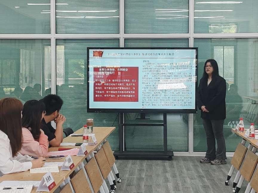 上政第26学生党支部的徐依阳以初心、为民、奋斗为主题的党纪小故事,激励大家反躬自省、寻找初心、笃定前行。张海悦为大家解读《中国共产党纪律处分条例》 新增或修改的重点条文。党课内容生动、贴近实际,向在场党员展示了中国共产党这个百年大党保持清醒的“初心密码”,引起了大家的共鸣和热烈讨论。