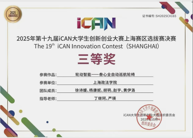 (经济管理学院徐诗媛、杨康妮、胡玥、赵宇、黄伊洛五位同学开展的“轮动智能--叁心全自动巡航轮椅”项目荣获三等奖)