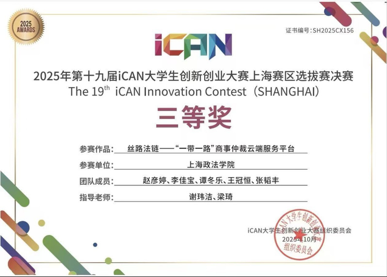 (经济管理学院赵彦婷、李佳宝、谭冬乐、王冠恒、张韬丰五位同学开展的“丝路法链‘一带一路’商事仲裁云端服务平台”项目荣获三等奖)