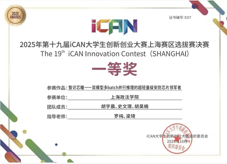 (经济管理学院胡宇晨、史文璟、胡吴楠三位同学开展的“智识芯瞳--双模型多batch并行推理的超轻量级安防芯片领军者”项目荣获一等奖)