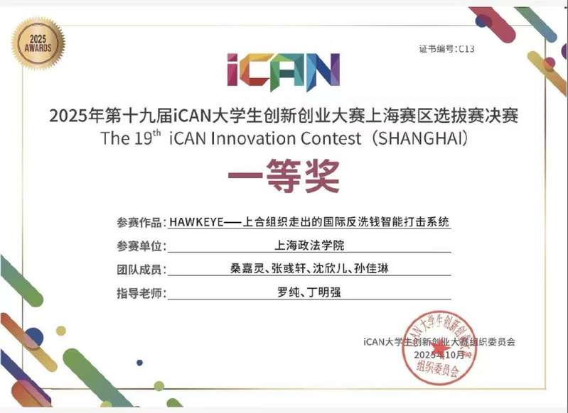 (经济管理学院桑嘉灵、张彧轩、沈欣儿、孙佳琳四位同学开展的“HAWKEYE--上合组织走出的国际反洗钱智能打击系统”项目荣获一等奖。)