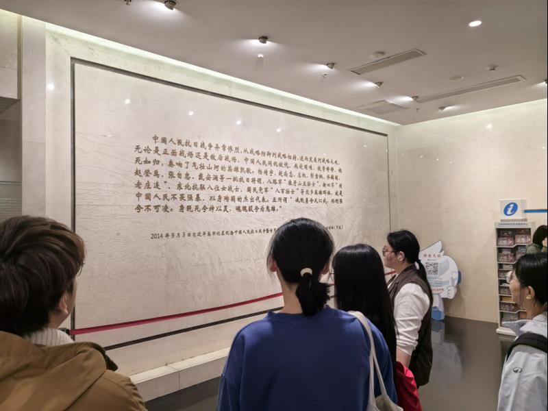 活动伊始,同学们参观了庄严肃穆的四行仓库抗战纪念馆。纪念馆外的墙体上还留存着当年的枪孔与炮弹的痕迹,岁月留下的斑驳将我们带回了那个烽火连天的抗战岁月。纪念馆分为“血鏖淞沪”、“坚守四行”、“孤军抗争”、“不朽丰碑”四大主题展区。每一幅历史照片、每一件实物展品、每一次场景复原,都生动再现了1937年淞沪会战中八百壮士坚守四行仓库、抗击日军的英雄壮举。支部党员们认真聆听、驻足凝视,深切感悟革命先辈为国家和民族挺身而出的家国情怀,接受了一次深刻的爱国主义教育。