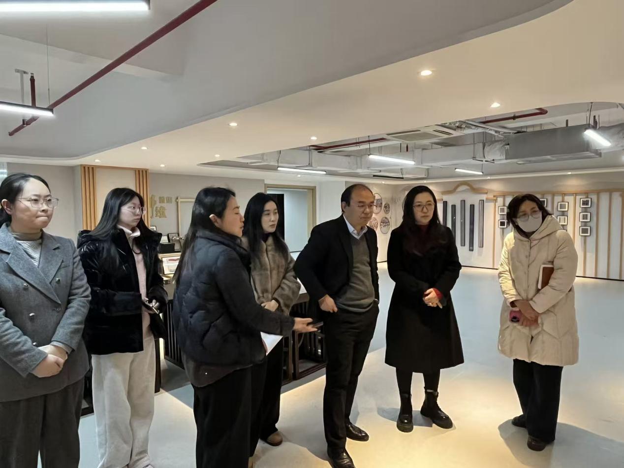 在佘山镇党群服务中心文化展区,学院教师观摩了地区非遗传承人作品展,详细了解非遗文化的历史脉络与当代转化路径,并就“传统文化赋能社区发展”的创新实践进行调研。在“映山红”品牌展位前,双方重点交流了“初心讲堂”“四季节庆文化”“产业集群培育”等特色项目的建设经验与未来规划,针对资源共建共享、非遗与产业融合等议题交换意见。