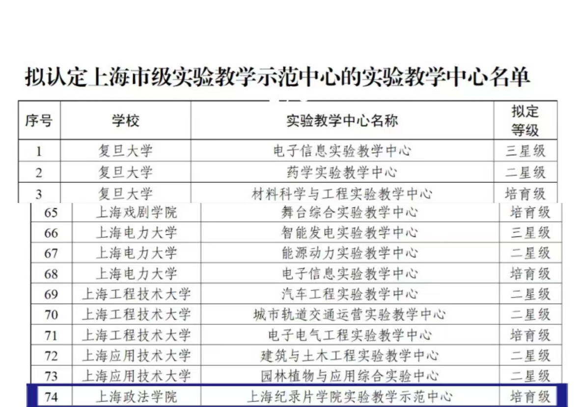 近日,上海市教委公布了2024年上海市级实验教学示范中心名单,经过学校申报、专家函评、专家会评和现场考察等程序,在全市认定实验教学示范中心三星级30家、二星级30家、培育级24家。我校纪录片学院实验中心获评“上海市示范性实验教学中心(培育级)”