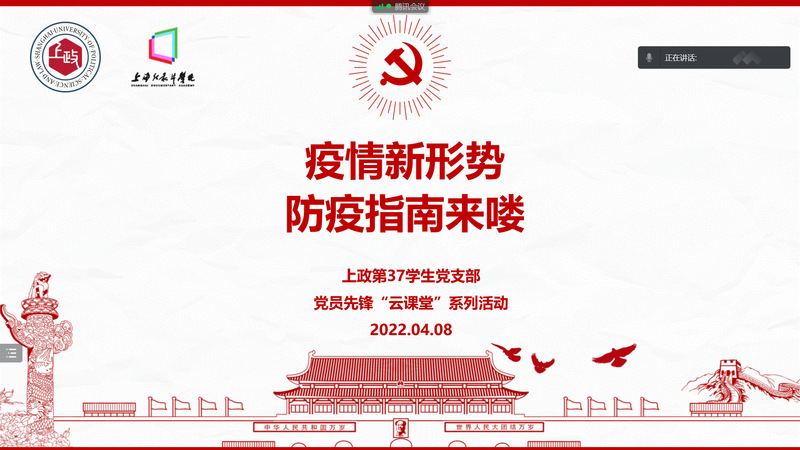 当前,上海疫情防控形势严峻,为深入学习贯彻习近平总书记关于疫情防控的重要指示精神,贯彻落实孙春兰副总理考察上海时提出的有关工作要求,按照市委有关工作部署,坚决守住疫情防控底线,切实维护师生生命健康和学校发展稳定大局。4月8日,上政第37学生党支部通过“腾讯会议”的线上云讲堂方式,举办党员先锋“云课堂”系列活动之疫情防控主题党课。本次党课以“疫情新形势,防疫指南来喽”为题,以加强爱党、爱国、爱校教育;加强疫情防控和网络素养教育和加强生命健康、感恩、社会责任教育为主要任务。上政第37学生党支部、纪录片第1学生模拟党支部以及纪录片学院师生共计106人参与本次党课。