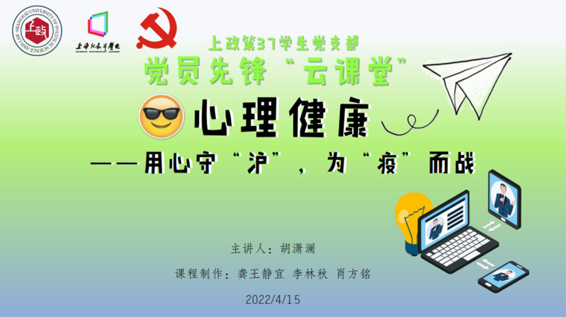自新冠肺炎疫情发生以来,我们从未停下战斗的脚步。在这场人类与病毒的较量中,不仅需要身体的抵抗力,同时也考验着我们的心理承受能力。为进一步加强疫情防控期间学生心理健康教育,有效缓解校园严格管理情形下学生的心理压力,引导学生保持健康阳光的心理状态。4月15日,上政第37学生党支部顺利开展了党员先锋“云课堂”系列活动第二课,本次党课以心理健康——用“心”守“沪” 为“疫”而战为主题,围绕疫情下的心理问题、问题产生的原因、可采取的缓解措施和活动展开。上政第37学生党支部、纪录片第1学生模拟党支部以及纪录片学院师生共计62人参与本次党课。