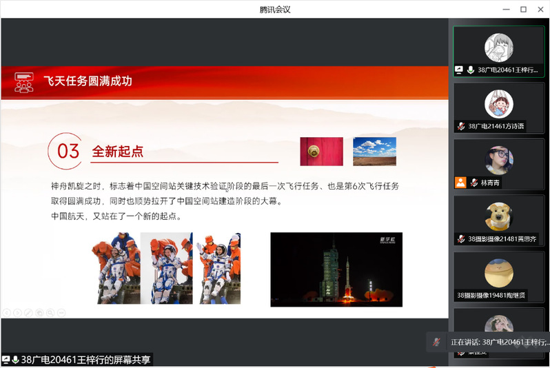 4月22日,上政第38学生党支部于线上举行了“学习航天精神,弘扬爱国情怀”主题党日活动。党支部副书记潘裕霞同志主持,党支部书记张勤勤与全体学生党员、模拟党支部入党积极分子共同参与。