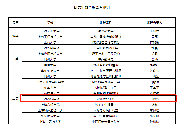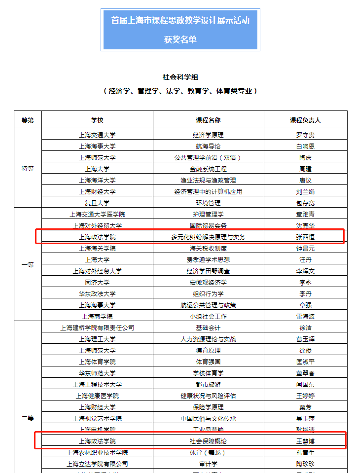 日前,上海市教委公布了首届上海市课程思政教学设计展示活动入选名单,我校推荐申报的3名教师全部斩获奖项。其中,法律学院张西恒老师《多元化纠纷解决原理与实务》课程荣获社会科学组一等奖,政府管理学院王慧博老师《社会保障概论》课程荣获社会科学组二等奖,政府管理学院时怡雯老师《宏观社会工作》课程荣获研究生教育综合专业组二等奖。