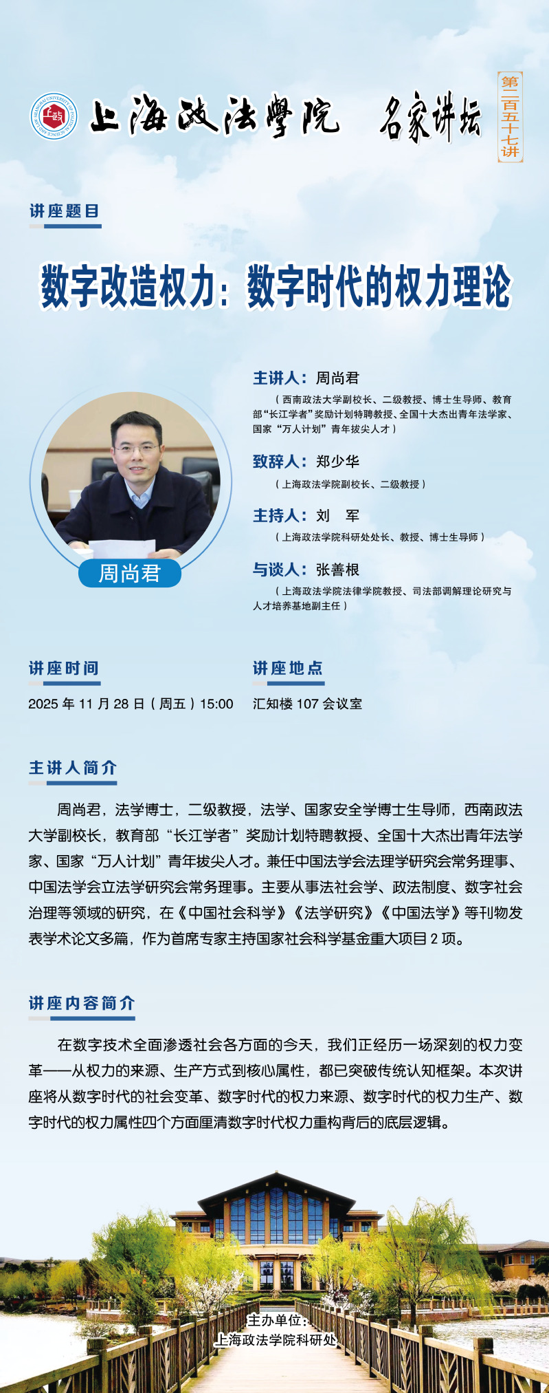 【11月28日 名家讲坛第257讲预告】西南政法大学副校长周尚君教授:数字改造权力:数字时代的权力理论