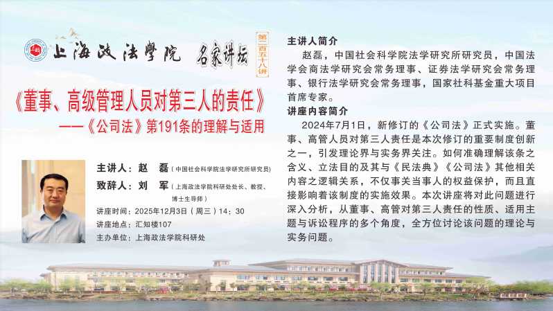 【12月3日 名家讲坛第258讲预告】中国社会科学院法学研究所研究员赵磊:董事、高级管理人员对第三人的责任——《公司法》第191条的理解与适用