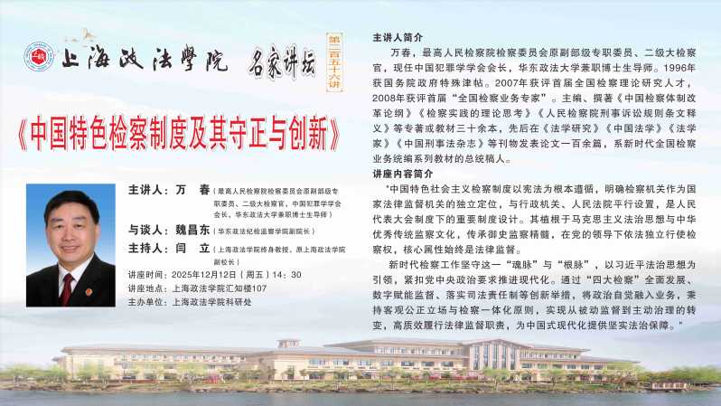 【12月12日 名家讲坛第256讲预告】最高人民检察院检察委员会原副部级专职委员万春:中国特色检察制度及其守正与创新