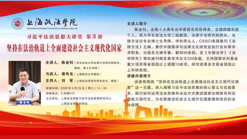 【3月25日 习近平法治思想系列讲座第3讲预告】华东政法大学法律方法研究院院长陈金钊教授:坚持在法治轨道上全面建设社会主义现代化国家