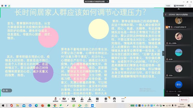 接下来,段老师与宋老师分别连线了几位疫情风险地区的同学,了解他们目前的防控形势与身心健康状况。其中,位于河北省的孙安琪同学表示自己所处的石家庄市正处于封城隔离状态,所需生活物资均采用“无接触”的线上购买、线下快递送达方式。在有效的隔离管控措施下,市区的疫情已经得到有效控制,新增病例也减至个位数。同时,她还积极参加了小区的抗疫志愿者服务工作,给密切接触者打电话询问、核实核酸检测结果,维持检测秩序等。其余几位风险地区的同学们也纷纷表示自己所在地市疫情传染的态势逐渐减弱,许多生产服务部门已经恢复正常工作,整体呈向好的态势。