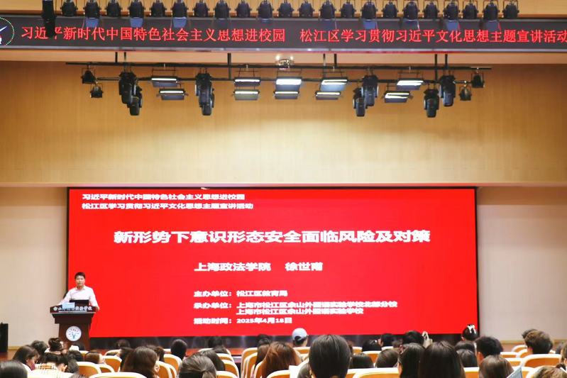 此外,马克思主义学院还积极参与松江区 “大思政课”建设。4月,学院党总支副书记徐世甫应邀参加松江区教育局主办、松江区佘山外国语实验学校承办的“习近平新时代中国特色社会主义思想进校园”主题宣讲活动,并做题为《新形势下意识形态安全面临风险及对策》的专题讲座,受到教育局及师生的高度评价。