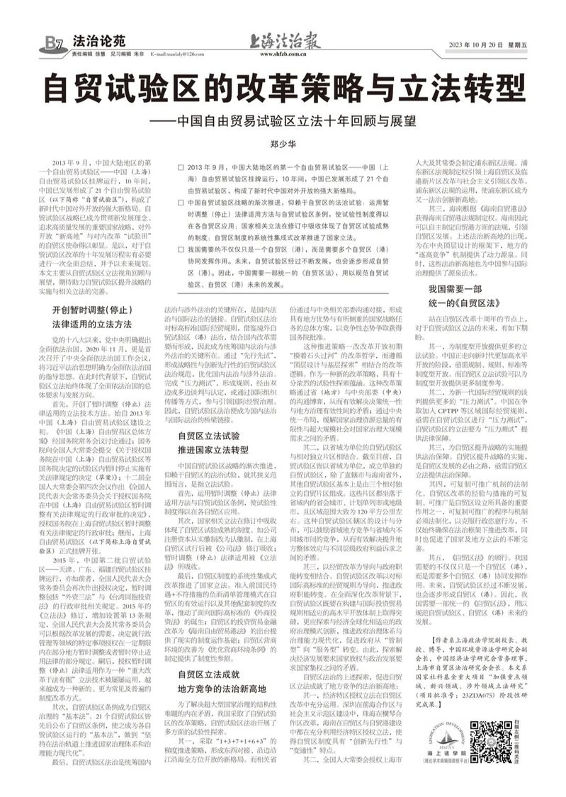 其五,《自贸区法》的颁行。我国需要的不仅仅只是一个自贸区(港),而是需要多个自贸区(港)协同发挥作用。未来,自贸试验区经过不断发展,也会逐步形成自贸区(港)。因此,我国需要一部统一的《自贸区法》,用以规范自贸试验区、自贸区(港)未来的发展。(原文刊登于《上海法治报》2023年10月20日B7版“法治论苑”,原标题为:自贸试验区的改革策略与立法转型——中国自由贸易试验区立法十年回顾与展望)