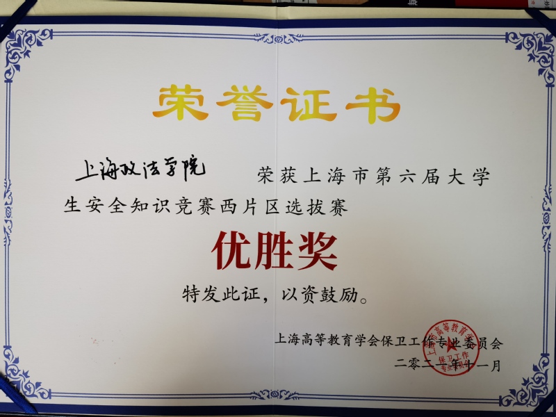为全面贯彻落实总体国家安全观,进一步巩固我市高校安全教育成效,推动大学生安全教育向纵深发展,11月6日,“我的安全我做主 学校安全共分担”上海市第六届大学生安全知识竞赛西片区选拔赛在上海工程技术大学举行,我校由保卫处谢颖杰老师带队,刑事司法学院卢瑶瑶、简岸琦、胡昊,国际法学院缪祺、曹颖五名同学组成的365英国上市公司代表队在此次比赛中经过第一轮分区赛的激烈角逐,获得优胜奖。